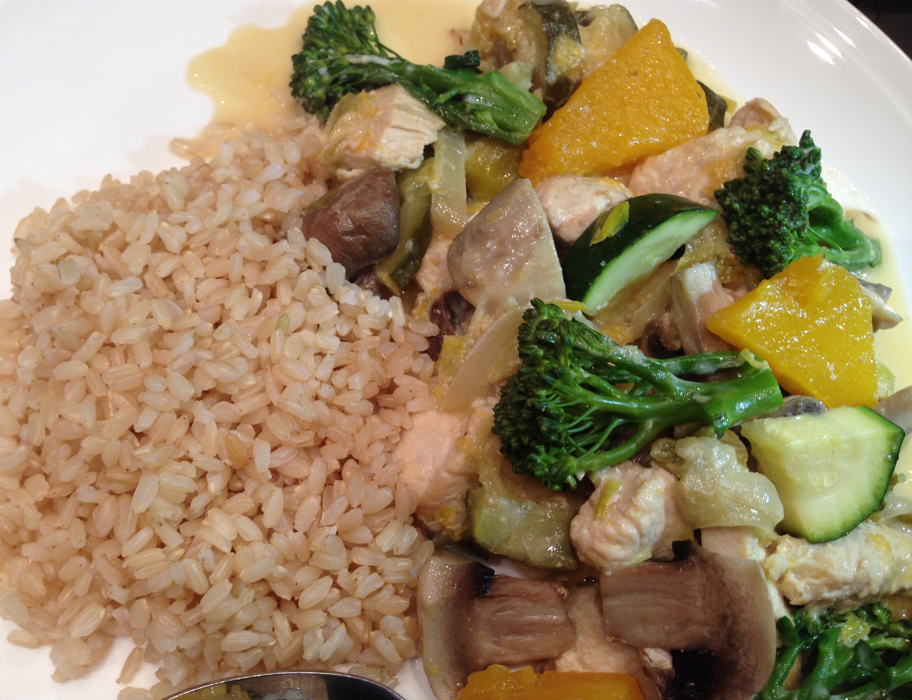 This dish is really tasty and very easy to prepare. For a vegetarian option, omit the chicken and double your vegetables. This combination of vegetables work really well with a creamy sauce. I am serving it with brown rice but you can use basmati or white if you prefer.