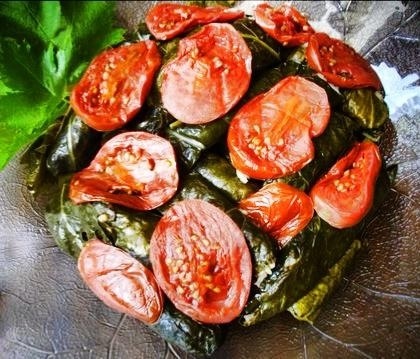 ” Vine leaves stuffed with rice and herbs (dolmades in Greece), are a sign that one is eating the food of eastern Mediterranean. Tender leaves should be harvested before sun and wind had done their damage. In South Africa, my mother once fooled a guest at the table and told him they were caterpillars, the big fat ones that hide in the grape vine”. This is Cecile’s introduction of this traditional eastern Mediterranean dish. She has also created a vine leaves roulade for those of us who have no time to roll.