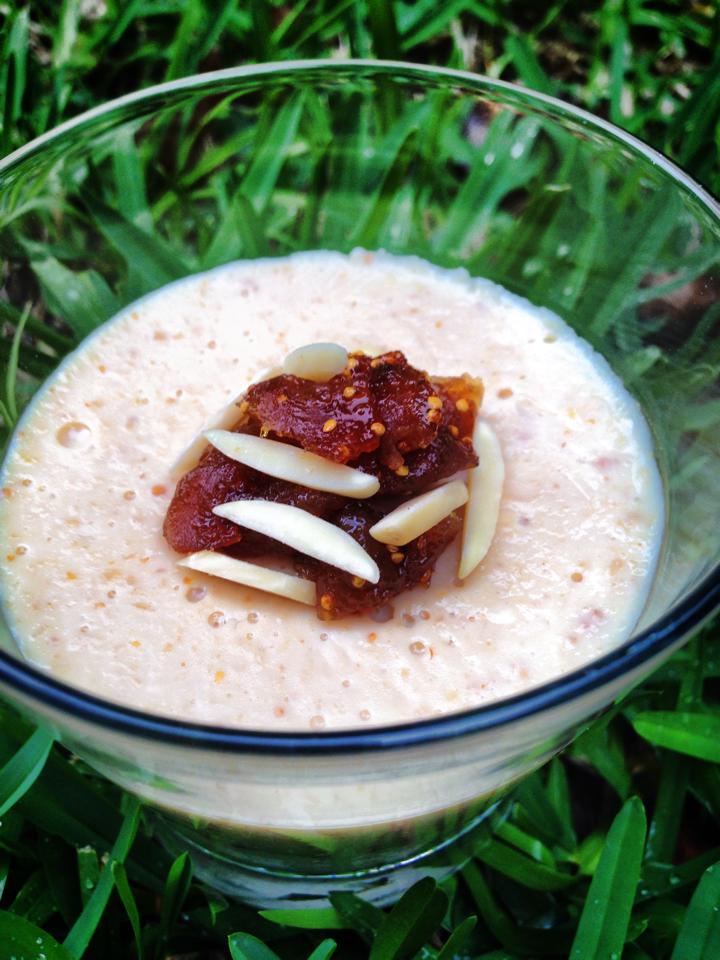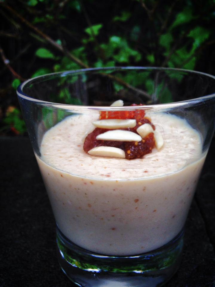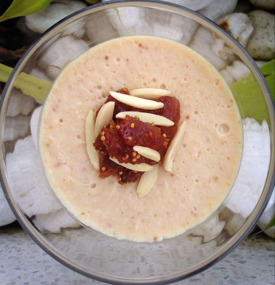 Use a ladle to pour mixture into 6 individual bowls or glasses. Put in refrigerator. To speed up the chilling process you can place in the freezer for about 30 minutes or so then move to fridge. It keeps well in the fridge for two to three days and it can be prepared the day before. Serve chilled and decorated with the extra figs and slivered almonds.