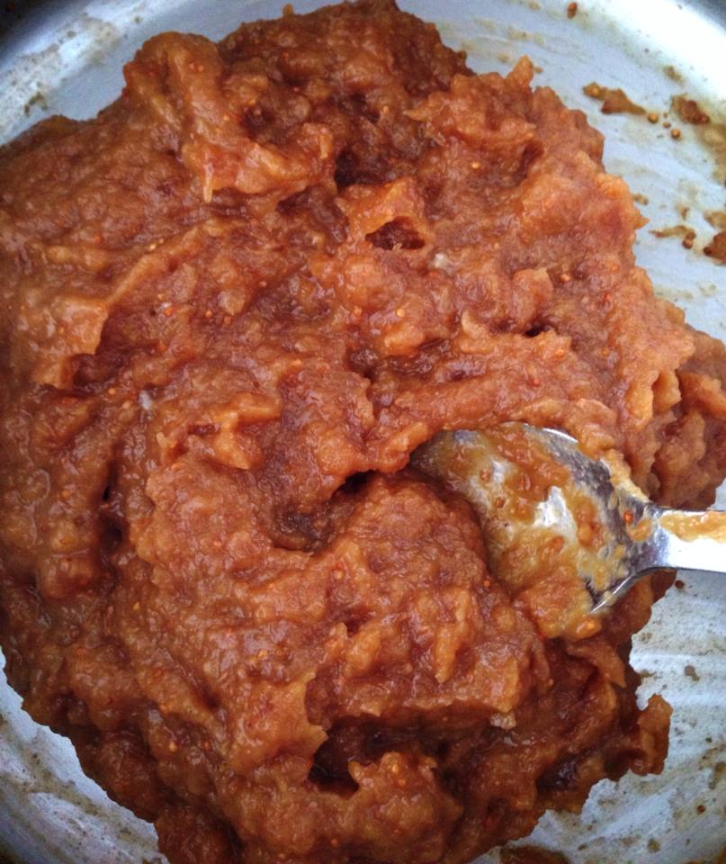 Dice figs and bring to boil in 1.5 cups of water, then simmer. Remove 2 table-spoons out for garnish after about 20 minutes and set aside, then slice later into thin strips for decoration. Continue to simmer the rest of the figs for another 10 minutes until they are tender. Make sure there is still enough liquid, so add water if necessary but not much. Blend in blender until smooth and puréed.