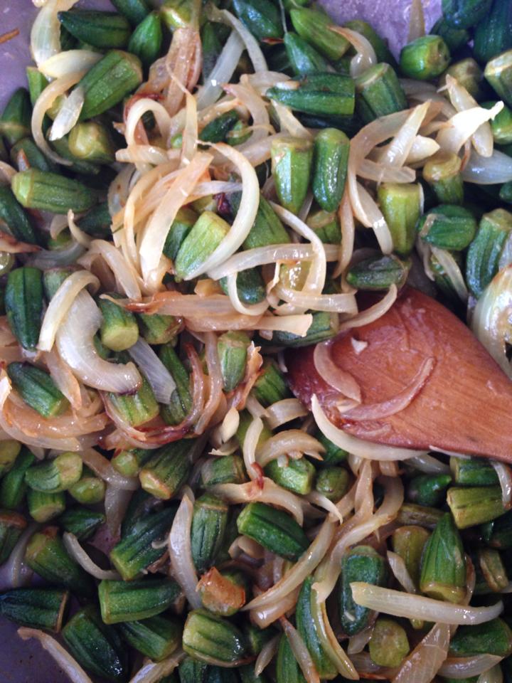 Heat olive oil in a wide pot, a wok is great, then add onions, fry on medium heat until golden. Add okra and garlic and pan fry for about tenย minutes, tossing it every now and then.