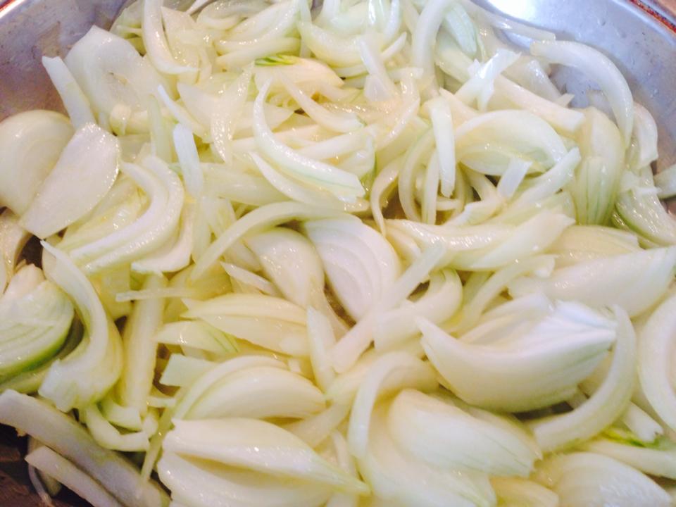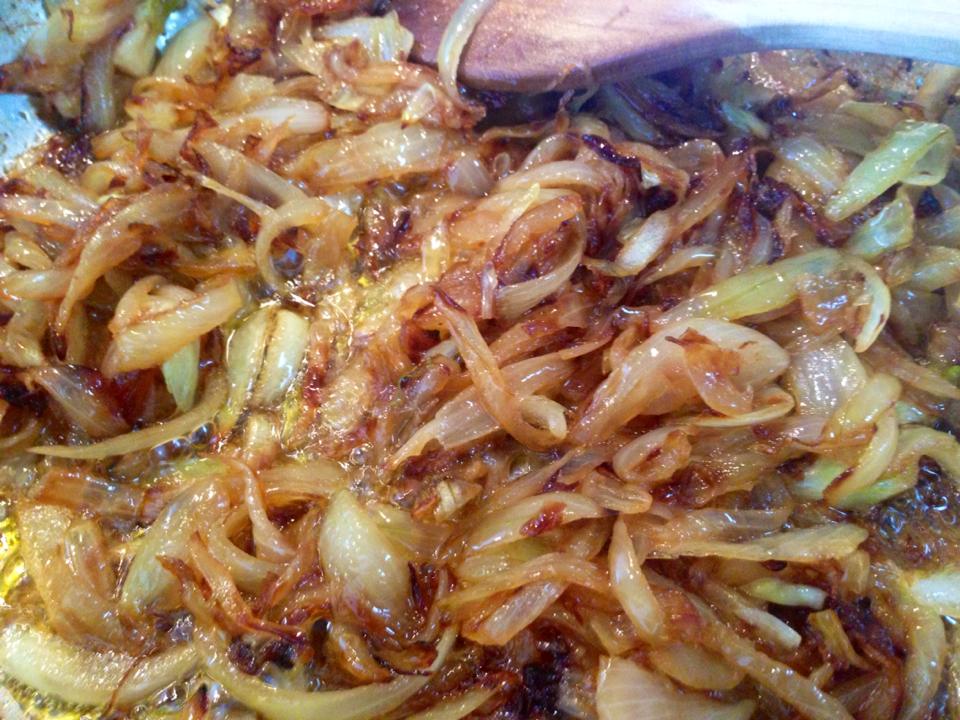 Wash curly endives really well, I do it by soaking them in a lot of water and then draining them. I repeat the process while rubbing the leaves against each other until there is no more sediments in the bottom of the bowl. I rinse them really well after that and put in a colander. Peel and slice onions into wedges, half a centimetre wide crescent shape (picture below). Put olive oil in a large pan, let it warm up then add the onions. Let it cook gently for about 45 minutes until onions are quite brown and caramelised. The onions need to be brown otherwise the dish will not taste as good.