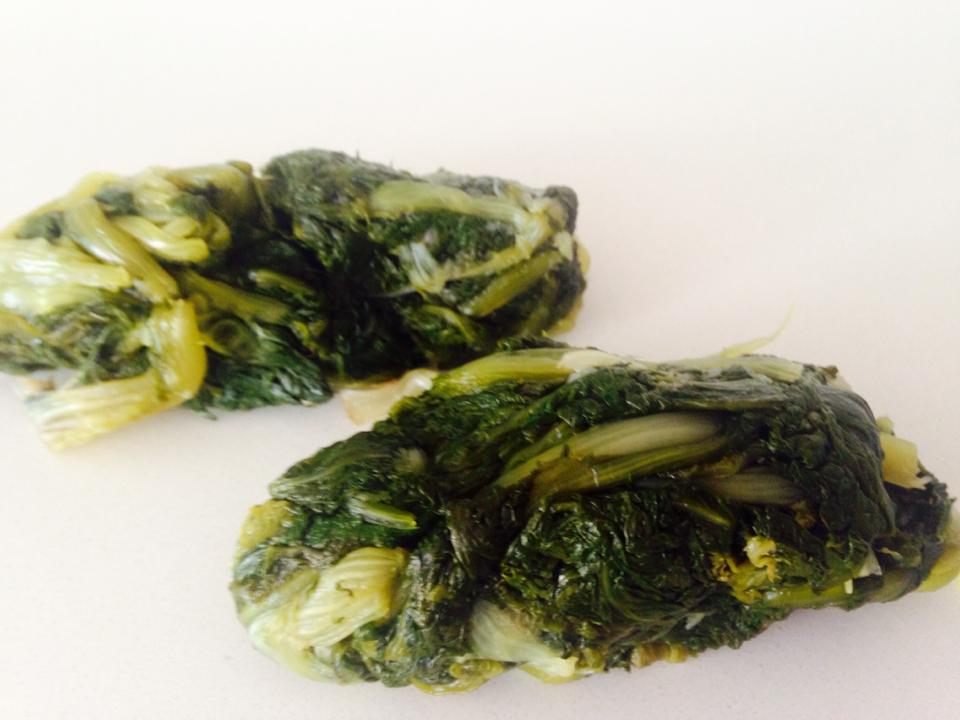 Curly endives, squeezed dry and shaped into a sausage ready to be sliced