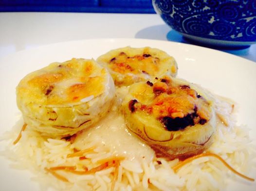 When artichokes are ready, remove and place in a baking dish, making sure that you keep the liquid. Add the milk to the liquid in the pot and dilute the corn flour with a bit of water and add to it, add sea salt to taste and stir on medium heat until it thickens. Fill each artichoke heart with the meat filling. Then place a tablespoon of liquid on top. Pour the rest of the sauce into the baking dish. Top each artichoke with a heaped tablespoon of grated tasty cheese and place baking dish in a 180 degree oven for about 20 minutes or until cheese has become golden in colour and melted. Serve on its own or with Lebanese rice pilaf (recipe below) and sauce. Fresh lemon wedges to squeeze on top of rice to taste goes really well with it.