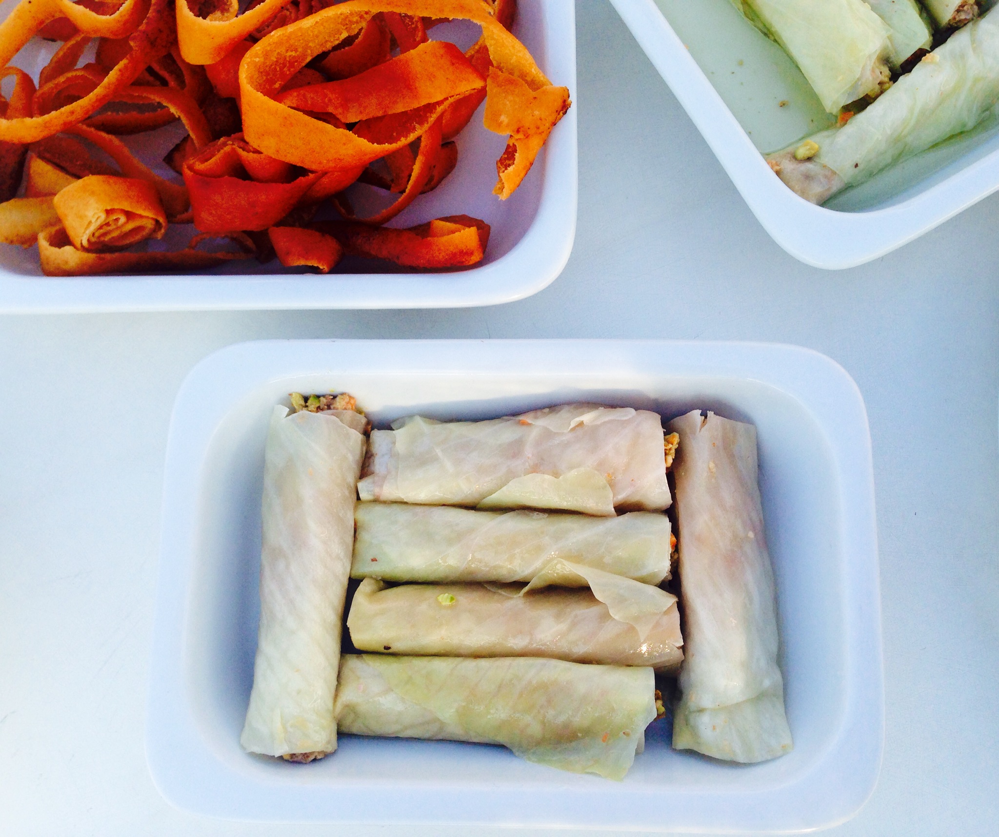 Vegetarian cabbage rolls, and fried curls of flat bread for dips or salad
