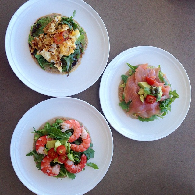 A trio of Salmon, prawns and scrambled eggs with avocado and baby rocket on a gluten, dairy and yeast free pancake.
