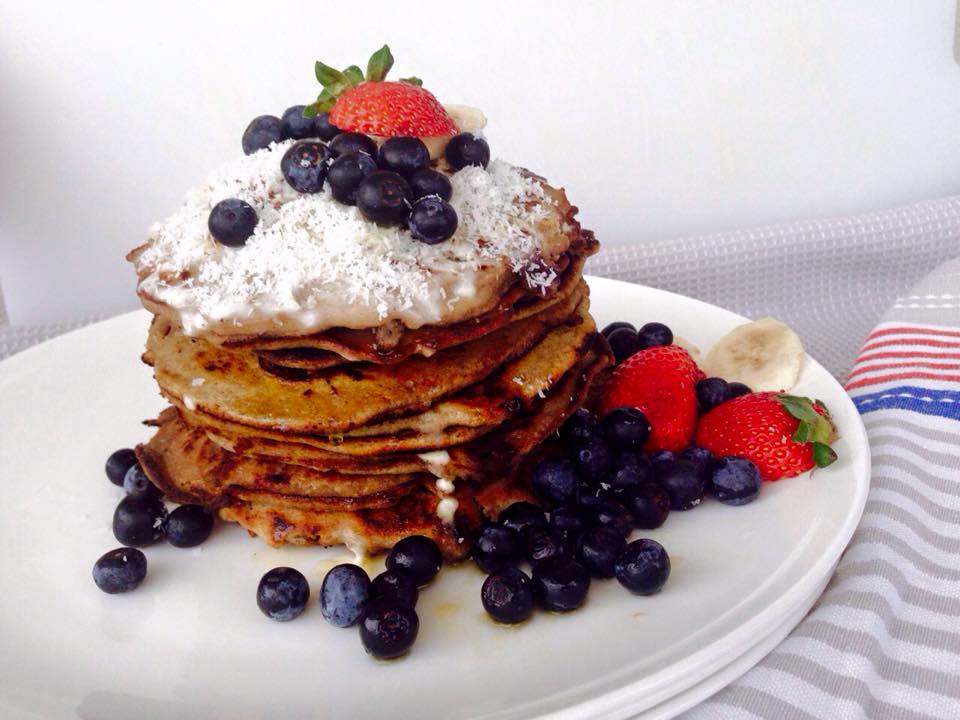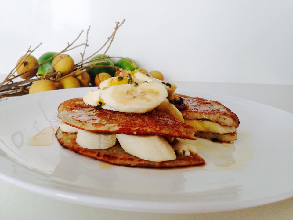I do not add any baking powder to mine, because I also want them yeast free, and they come up great, but you can add 1 teaspoon of baking powder if you like them extra fluffy.If you look at the ingredients list, you might think that’s too many for a pancake. However once these flours are in your cupboard, honestly these pancakes are so easy to make. You can also substitute the coconut water for just water, but they do taste better with coconut water. Just that extra bit of special flavour. Of course you can use this batter plain without the blueberries, it is just as delicious. I love my plain pancakes topped with mapke syrup, bananas and passion fruit.