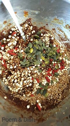 Place cocoa butter in a bowl on top of another bowl with hot water(bain-marie) for a few minutes until it melts. Add coconut oil, date mixture and raw cocoa powder and mix together. You can also place it back in blender and blend for a few minutes. Add all other dry ingredients and mix well.